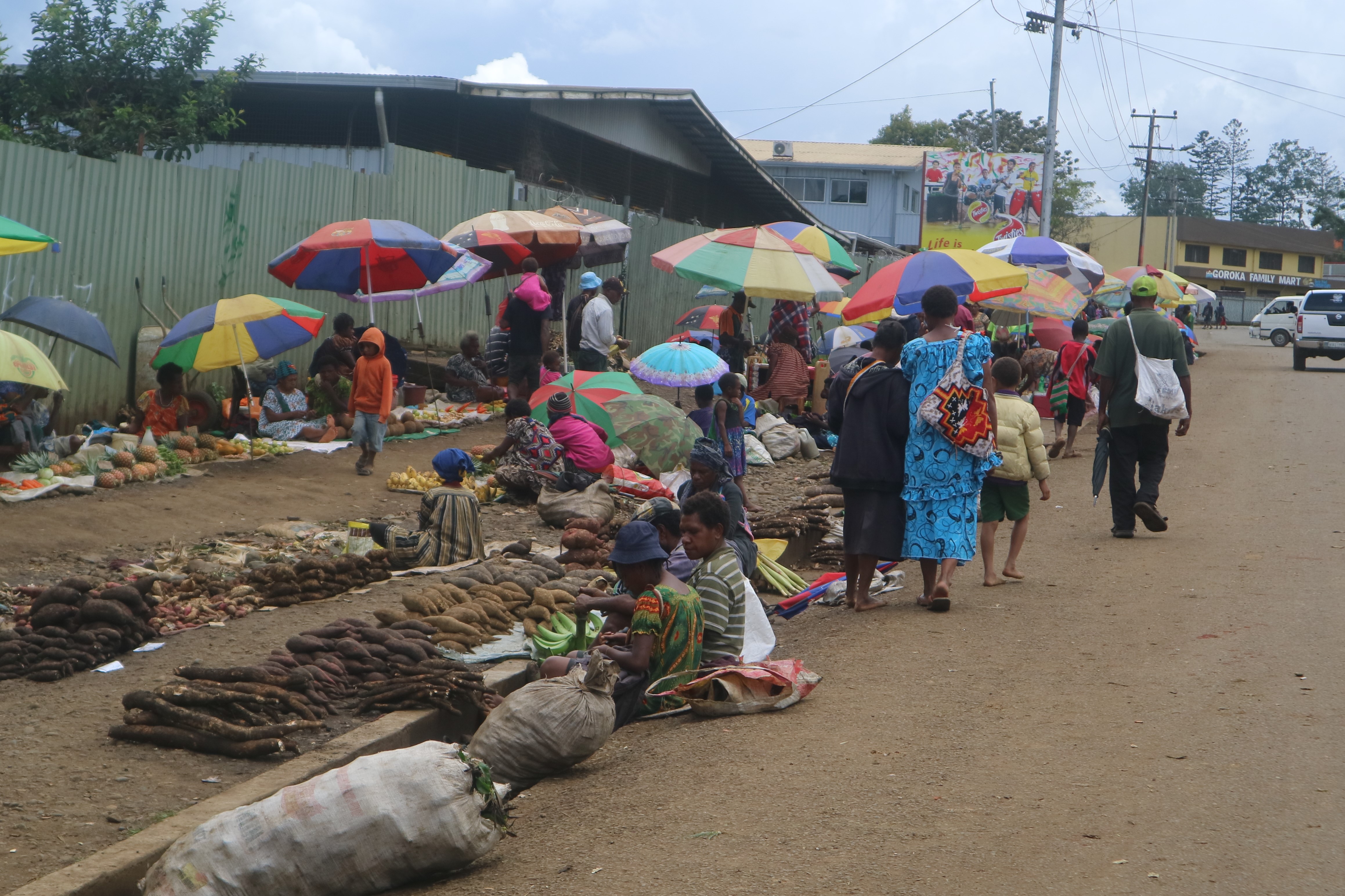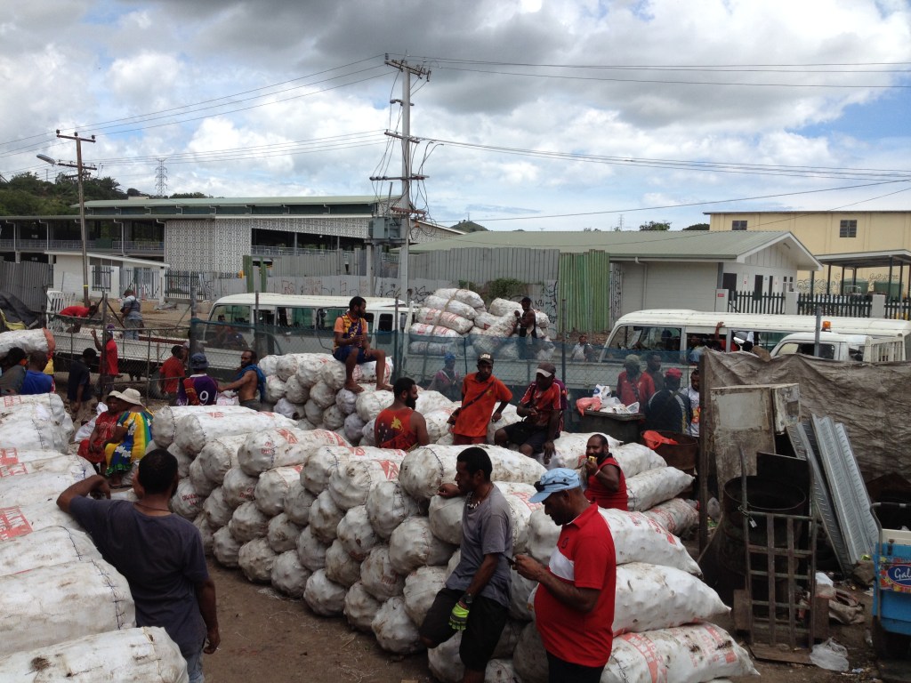The scale of trading has also increased. In the past each vendor sold relatively small volumes of produce, however now some producers and wholesale traders transport hundreds of bags of produce at a time. This practice has been around for some time, but the scale at which it is occurring has increased. This image shows bags of sweet potato transported from the highlands region being sold at a wholesale yard opposite the main marketplace (Gordons) in Port Moresby. Several similar wholesale yards exist nearby. The new Gordons Market was under construction in 2019 when this photo was taken.