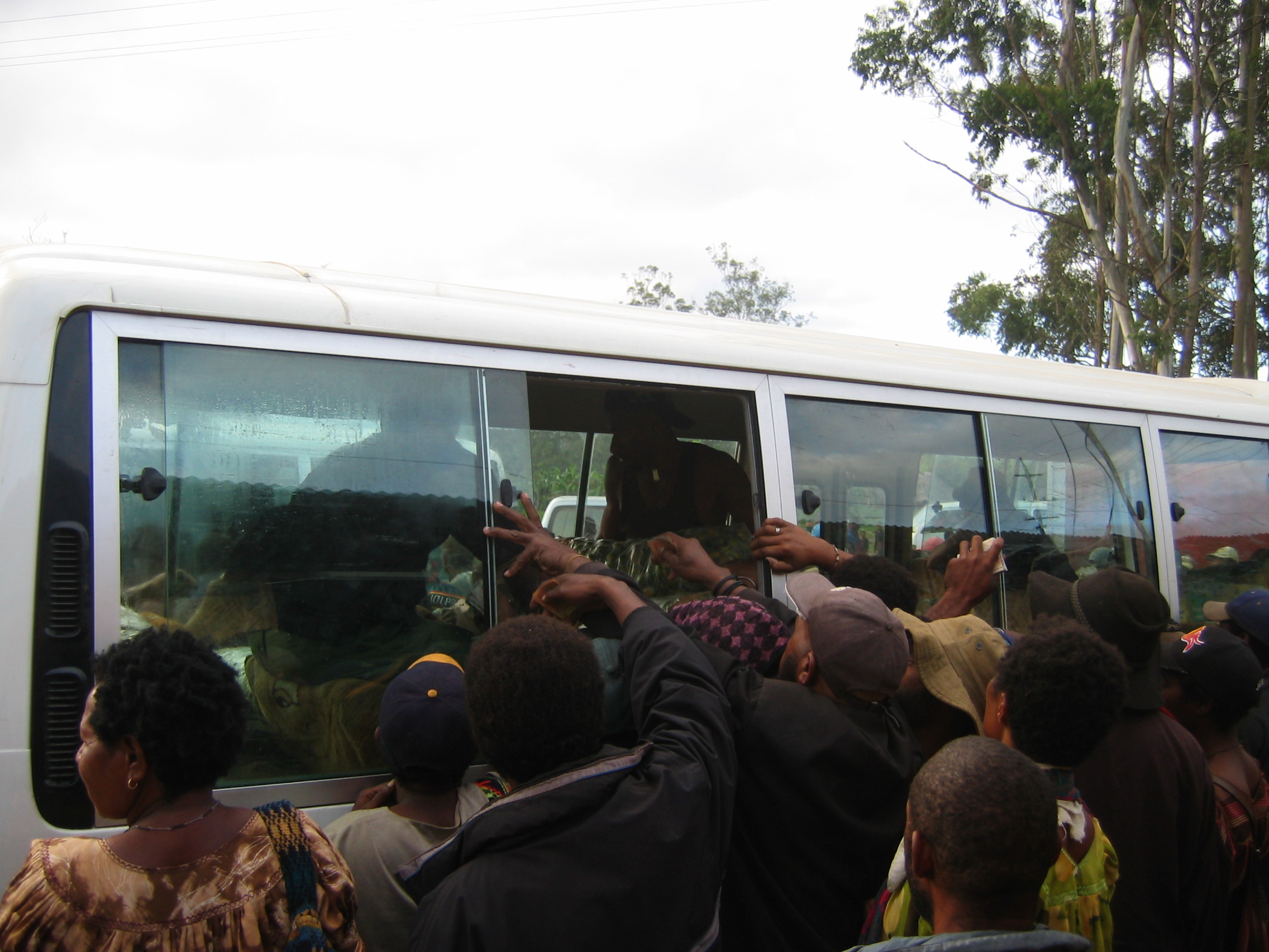 Haggling and competitive trading behaviour has historically been uncommon in PNG’s marketplaces. But with the rise of reselling, and with more people dependent on trading for their livelihood, it is increasingly common for people to haggle over the price, for vendors to call out to prospective customers, and for resellers to compete with each other to secure produce to sell. Competitive trade practices are particularly evident in the betel nut trade, but they are also increasingly common in fresh food transactions. This photo, taken at Kaiwei Market in Mt. Hagen, shows marketplace resellers competing with each other to buy bags of betel nut from wholesale traders located in the bus. Betel nut was undersupplied on this day. When the marketplace is flooded with betel nut there is more haggling between the wholesale traders and the marketplace resellers.