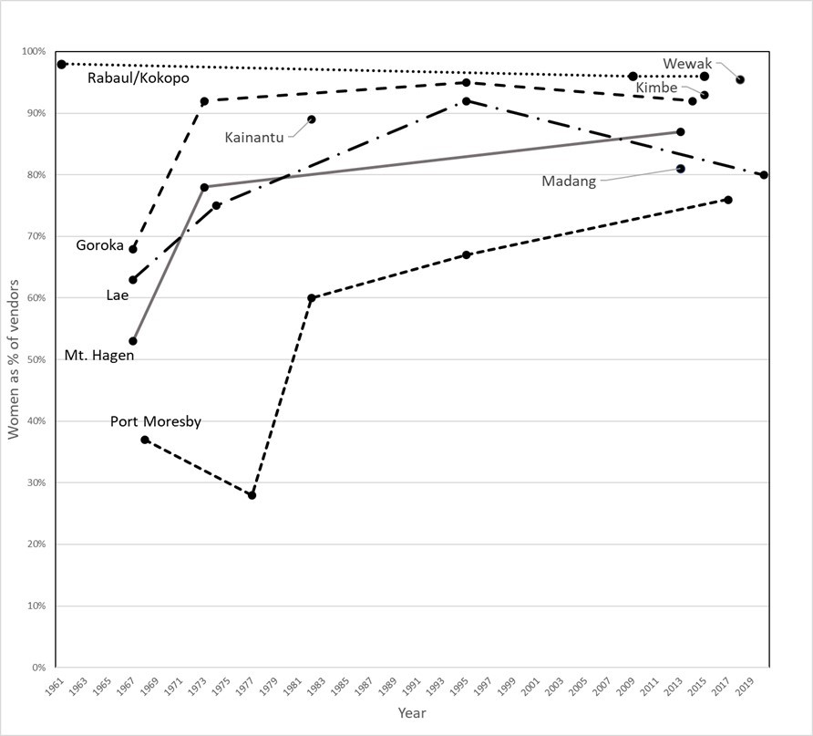 This transformation is documented in our recent paper in Asia & the Pacific Policy Studies, in which we review changes in PNG’s fresh food marketplaces between 1961 and 2022. We draw on studies in 20 urban centres, as well as casual observations from many other marketplaces. From the early 1960s to the mid-1980s, there was considerable research on marketplaces. Since then, there have been fewer detailed studies, but the research that exists provides snapshots of particular marketplaces at particular times. In our paper, we compile these snapshots to obtain a picture of significant changes in PNG’s open-air marketplaces – changes that have important implications for social planners and development specialists.
