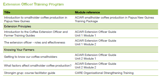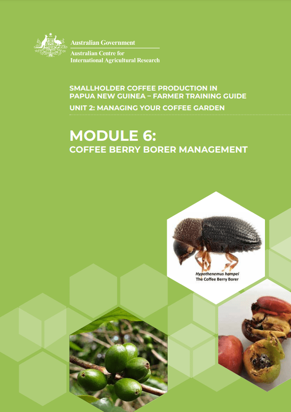 The CBB management guide is part of the Smallholder Coffee Production in Papua New Guinea Training Package, a package that has been designed to assist extension officers in delivering training for farmer groups in the production, processing and marketing of coffee, and to allow the training of new extension officers to extend the reach of the farmer training program. The training package consists of 4 modules for extension officer capacity building and 17 modules covering coffee production and marketing by smallholders.